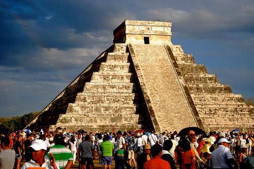 El Castillo金字塔,還有許多設計巧妙的地方, 其中一個就是在春季和秋季的晝夜平分點,日出日落時,建築的拐角在金字塔北面的階梯上投下羽蛇狀的陰影,並隨著太陽的位置在北面滑行下降(這段文字從維基百科剪貼下來的,我想大家都看不懂在寫啥鬼吧)。 導遊有拿張照片給大家看, 看了就懂到底在說啥了。