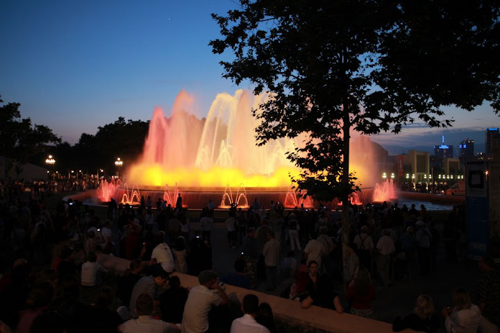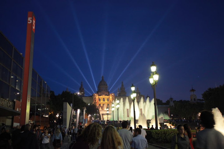 走去加泰隆尼亞美術館的路上,人山人海的,一路上都是美麗的噴泉,越靠近美術館噴泉越大。 美術館旁邊在辦園遊會,音樂放的好大聲, 我們倆心終不免疑惑西歐人是不是每個周末都在開趴體狂歡呀,怎麼我們兩才待了兩晚, 兩個晚上都有活動節慶呢!