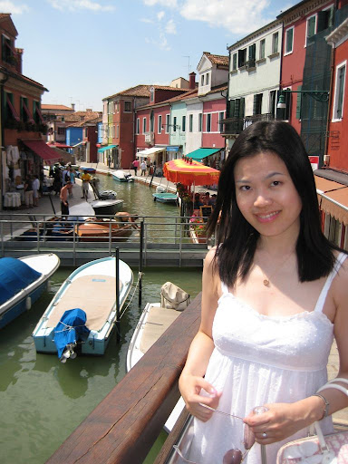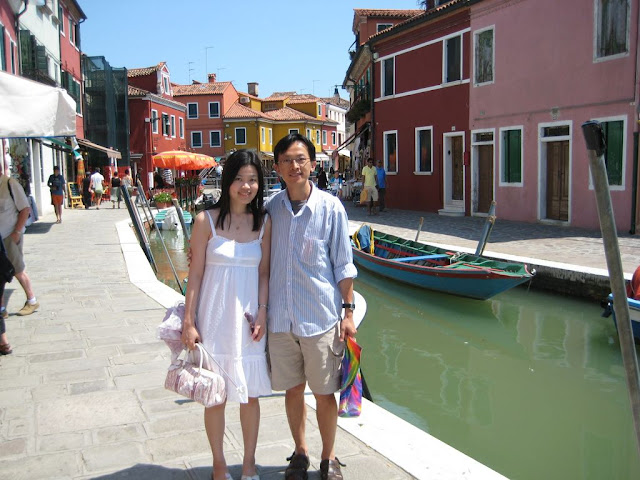 除了本島外, 我們還搭船去了另一個稍遠的外島-Burano。這是個色彩繽紛的小島,以前這島嶼是以漁業為生, 丈夫們出海打魚隔了數個月回來後常常忘了自己家而走錯(分明就是外遇的藉口吧),所以居民就各自把自己房子漆成不同的顏色免得丈夫回錯家嚕。這小島因為離本島遠些觀光客比較少, 感覺寧靜許多,少了很多喧囂, 而且五顏六色的房子又挺可愛的, 算是僅次於本島我最愛的島了。