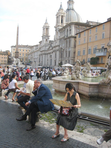 羅馬吸引我的不是這競技場,而是這整個城市可以把所有古蹟保存如此完善,新舊城市交替其中而不顯突兀, 處處散布著廣場,噴泉與教堂, 每棟建築都雕繪著精緻的雕刻, 任何一街一角都是如此的的豐富與迷人。 我們只能走馬看花的看了羅馬最大的廣場 ─ 象徵義大利統一的威尼斯廣場(Piazza Venezia),古代文豪聚集的西班牙廣場(Piazza di Spagna)以及擁有三座知名噴泉的那佛納廣場(Piazza Navona)。