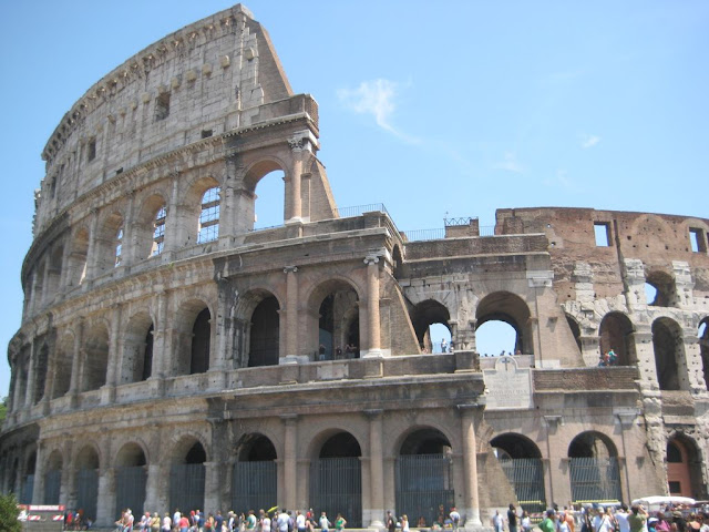 有感於我們兩人很容易被羅馬建築的一磚一瓦給吸引而忘了時間,所以我們兩人決定先直衝去羅馬競技場(Colosseum),免得到時候沒時間看到這景點就離開了羅馬。Colosseum是羅馬時期最大的圓形角鬥場,現在僅剩遺跡,不過外表保持良好,看了仍讓人讚嘆這建築之龐大, 內部則破舊殘缺,雖然光天化日下,想想以前多少殘忍的人獸屠殺在此發生仍讓人不禁寒顫。